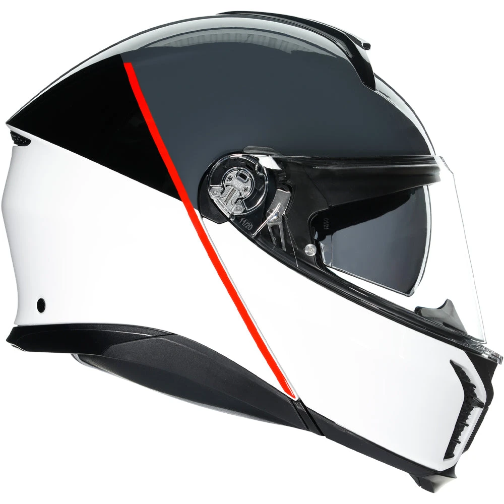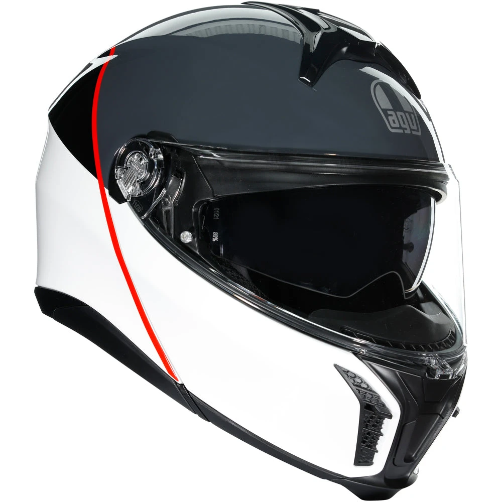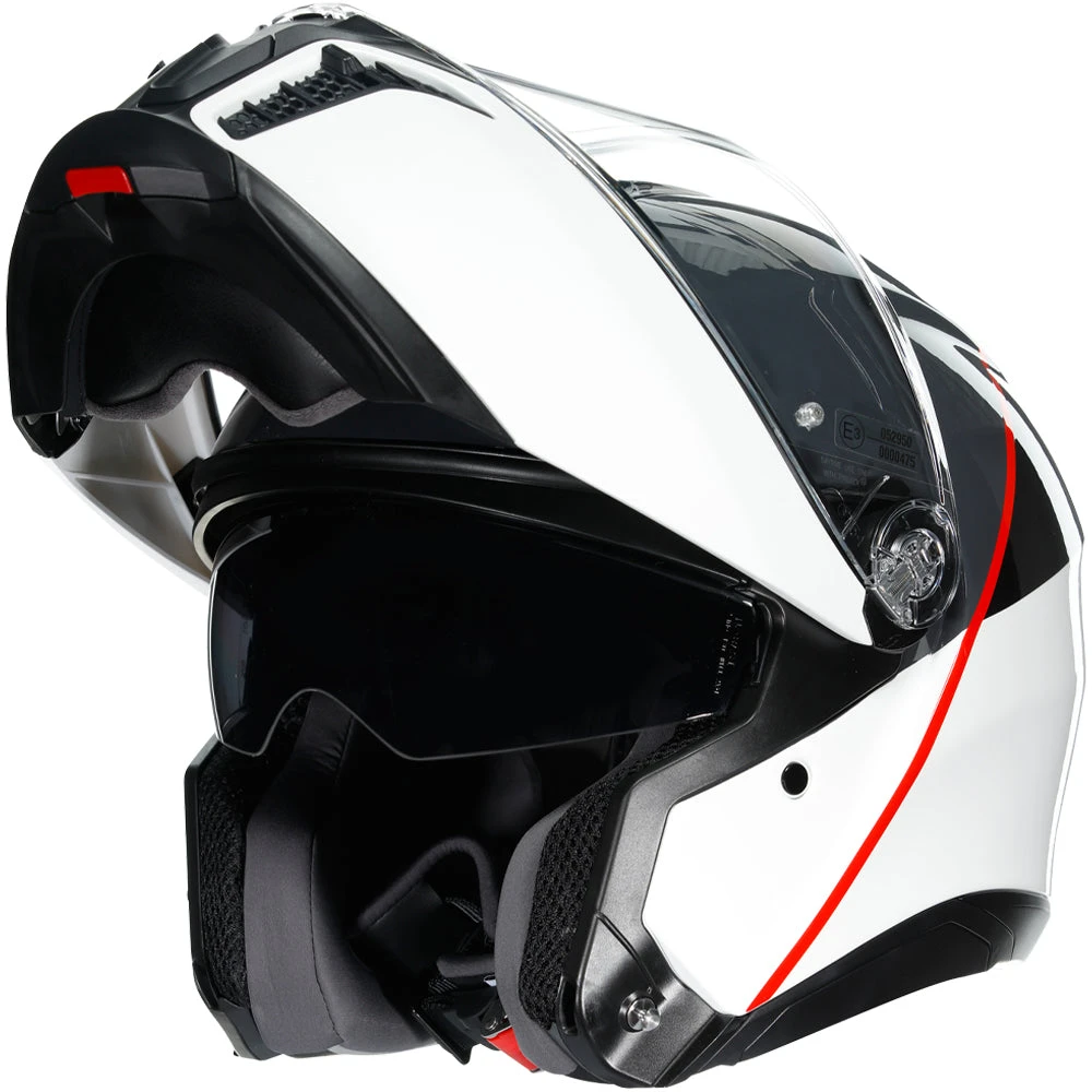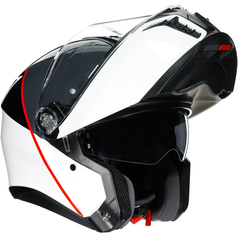 The soft Ritmo and Shalimar fabric interiors, with personalized fit system, ensure that moisture and sweat are absorbed immediately. Waterproof synthetic leather piping keeps water out of the helmet interior on the rainiest of days. The AGV Micro-opening system allows you to keep the visor open for airflow while keeping it securely attached to the chinguard.