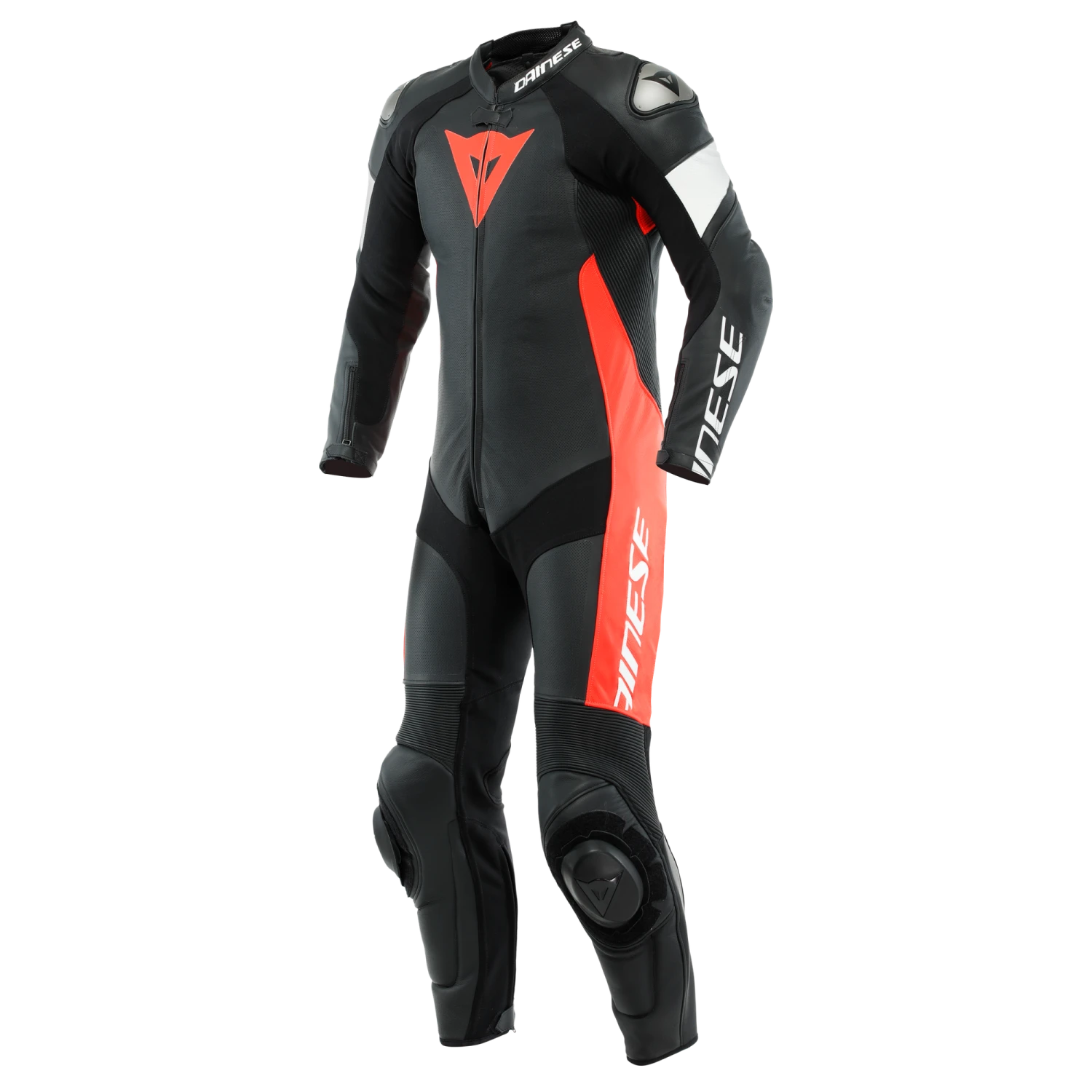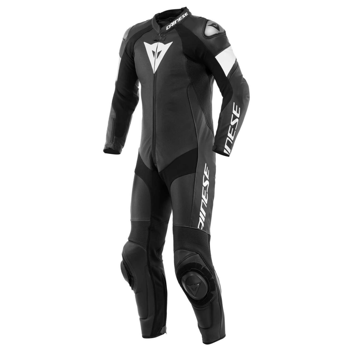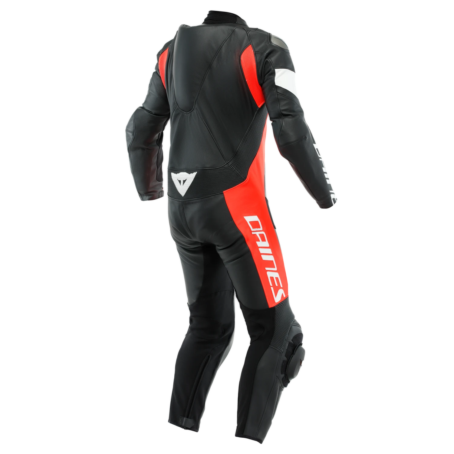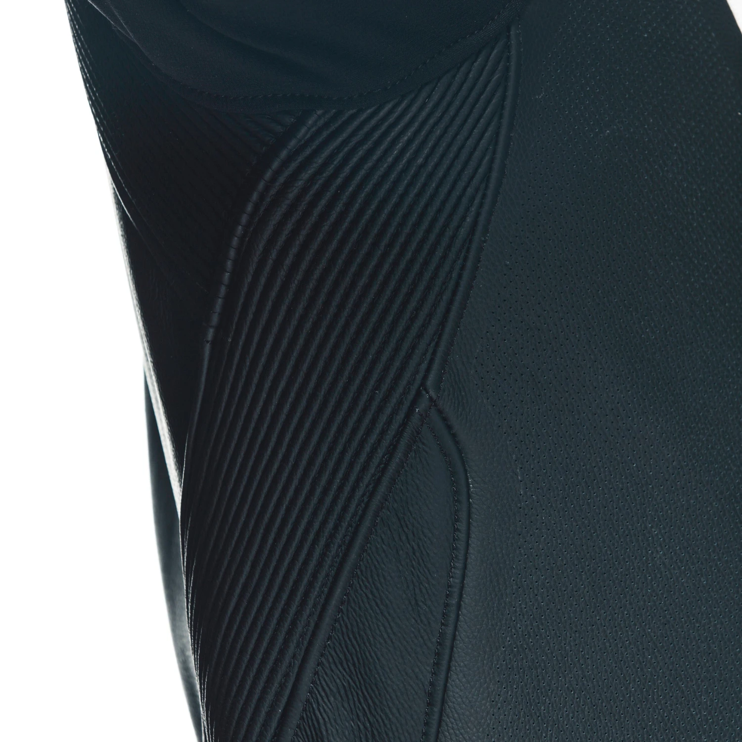 Dainese Tosa one-piece motorcycle suit with CE EN 17092 certification made of premium perforated Tutu cowhide for optimized temperature on hot days. The classic Dainese fit is slim and fitted, while at the same time providing great freedom of movement due to the S1 elastic fabric inserts on the inner arm, groin, and back leg areas. The biaxial stretch fabric inserts on the back, as well as the stretch patches on the knees and shoulder blades, are designed to simultaneously guarantee that all skin is protected, in addition to maximum flexibility and freedom of movement. The special protection system combines Dainese’s classic internal protectors with removable sliders on the knees and interchangeable aluminum plates on the shoulders: A distinctive Dainese technology designed to support and facilitate sliding in case of a fall, thus preventing the dangerous risks of rolling caused by grip on asphalt. The aerodynamic hump is designed to accommodate the water bag, which can be connected to the helmet. It is placed at the shoulders and neck to protect the upper back, performing a function complementary to the back protector.
