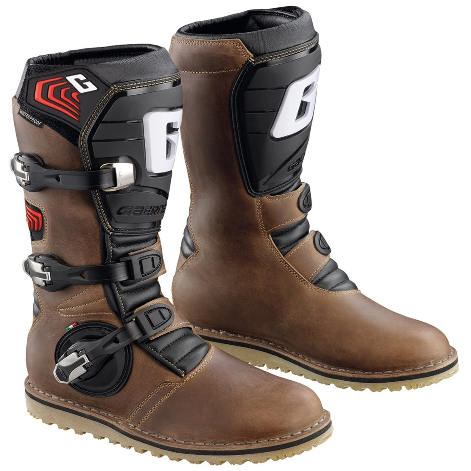 These extremely durable boots are made with full-grain oiled leather. They feature an injection moulded front shin guard and three new alloy buckles, which are replaceable. They are also waterproof thanks to a breathable membrane liner we call Gaerne Drytech. A gum rubber sole completes the task for better grip and control of the bike.